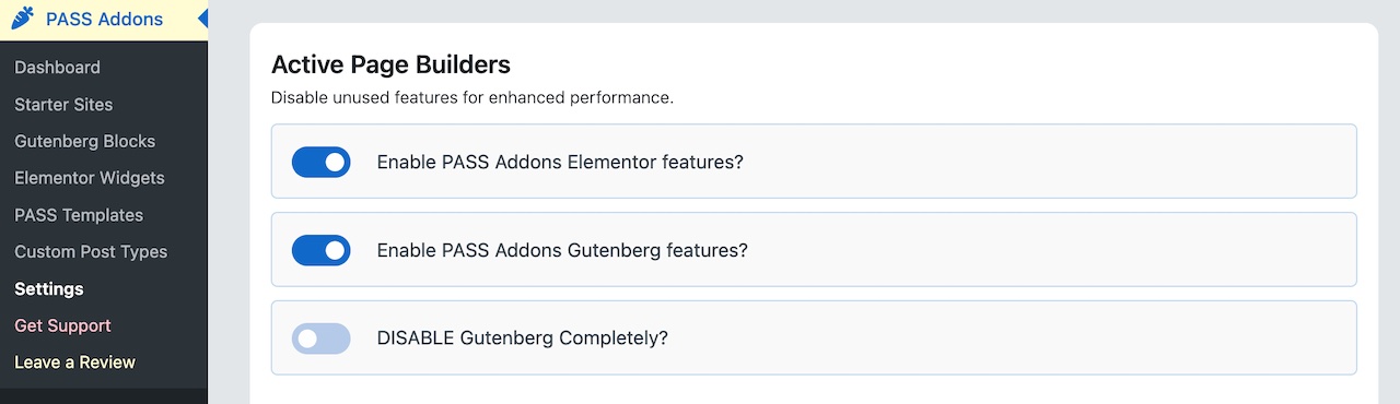 - Under Active Page Builders, toggle off Enable Gutenberg/Elementor.