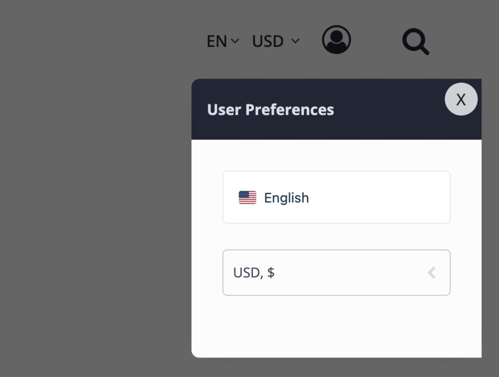 Once selected, the appropriate switcher will automatically appear in the site header. Visitors will then be able to change the language or currency based on the options configured within your selected plugin.